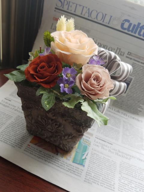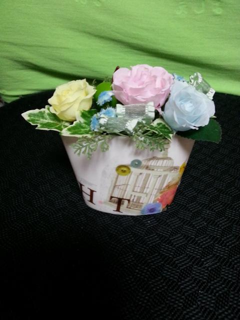 デコパージュを施した器入りプリザーブドフラワーアレンジメントです・・・